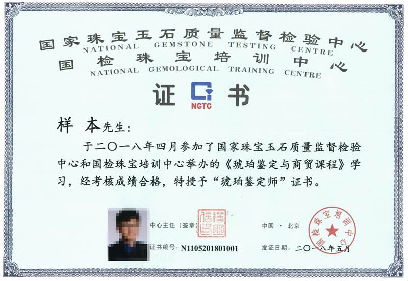 课程结束后,经考试合格,将获得国家珠宝玉石质量监督检验中心和国检珠宝培训中心联合颁发的“琥珀鉴定师”证书。