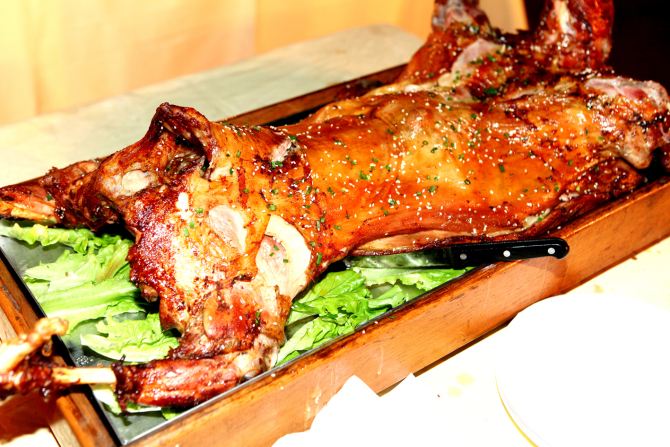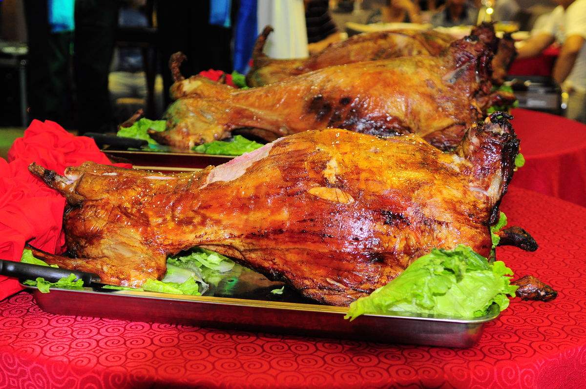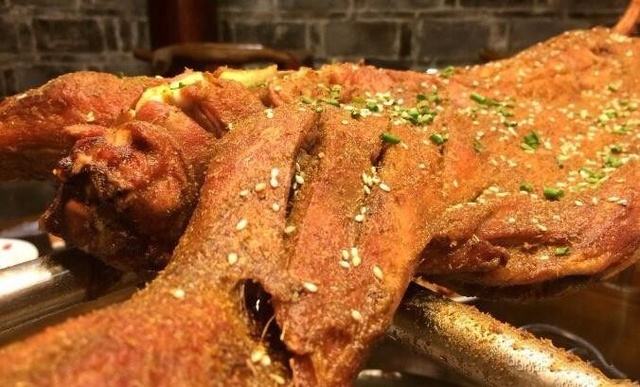 烤全羊是东北的一首佳肴名菜。烤全羊味道香醇,色美肉嫩,浓香外溢,佐酒下饭,老少皆宜,实乃草原美肴之一