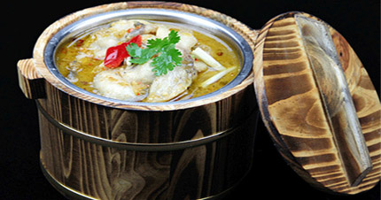 木桶鱼的烹饪技巧及火候很讲究,要把活鱼点杀之后将鱼片腌制3-5分钟,把石头加热至300—500度高温,取鱼骨加入秘制高汤特殊配料煮熟,配上青笋、黄瓜、西红柿等,先将鱼片倒入装有高温石头的木桶内,再加入熬制好的鱼骨汤焖煮2—3分钟即可食用。木桶鱼火锅不仅因洋气的木桶锅吸引大家的眼球,并且其独特的鲜美的鱼配上美味的汤料,使鱼的鲜味发挥的淋漓尽致,无论是家庭聚会还是朋友小聚火锅都是不二之选,人多还是人少都可以享受火锅给大家带来的美味。