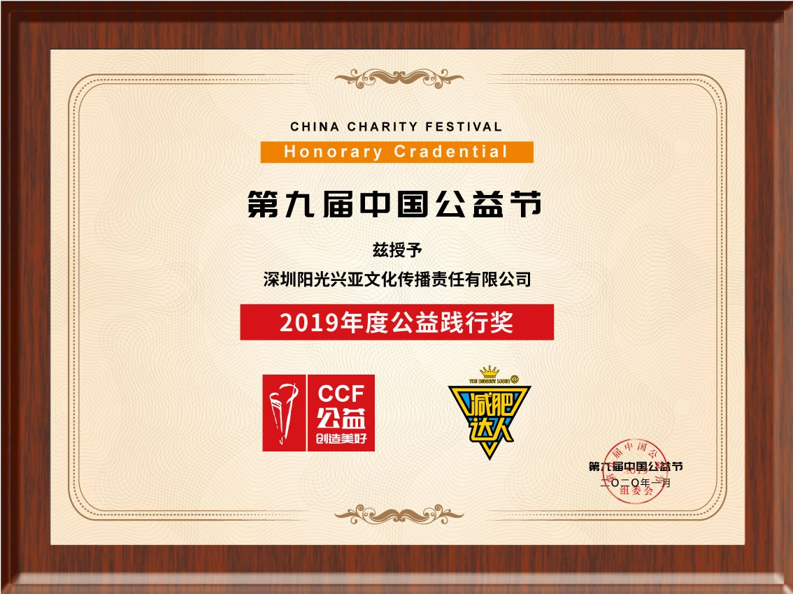 荣获第九届中国公益节“2019年度公益践行奖”疫情期间举办线上公益战疫赛,打造中国首 个运动减肥体育小镇,持续深耕健康领域,