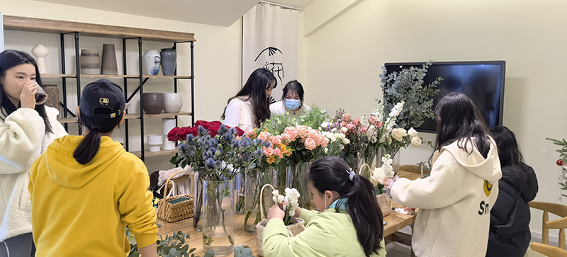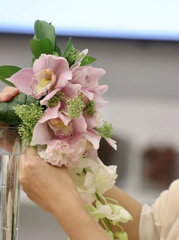 理论课“鲜花养护知识”,讲解如何挑选花材、花材的养护与保鲜、营养液的使用、剪根、醒花、如何将花催开等技巧