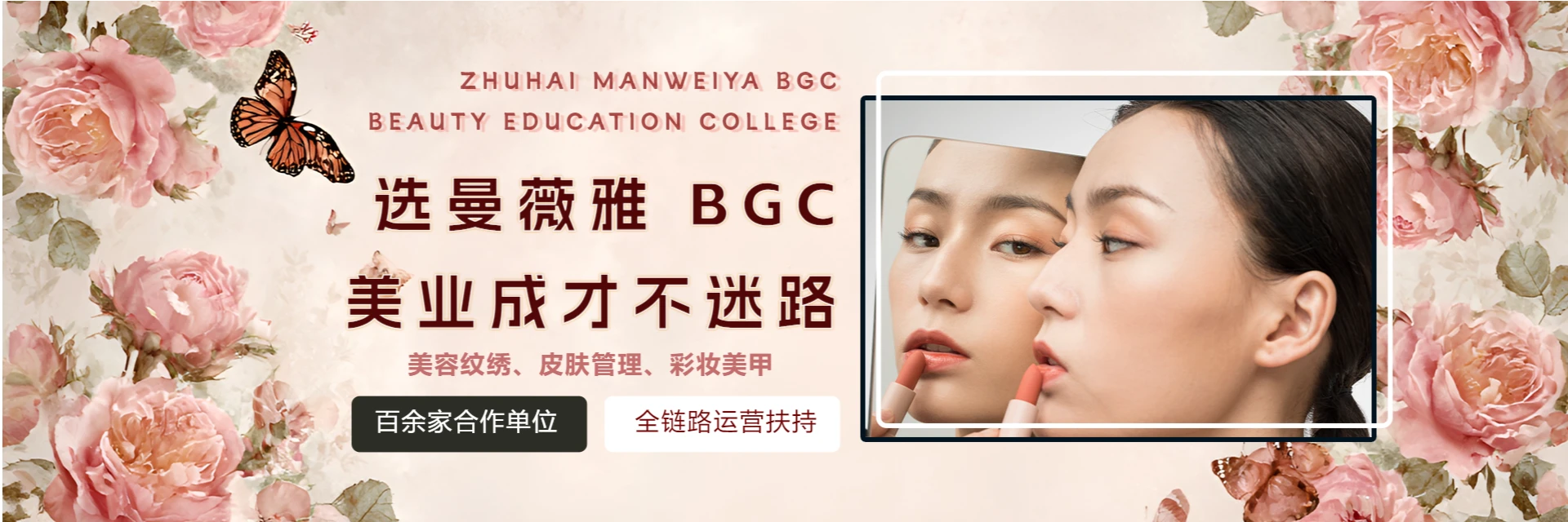BGC美容教育学院奉行严谨、创新、安全、专业理念,打造中韩最纯正美业教育品牌。学院首创‘培训+技能+学历+就业+创业’教学模式,配备50位行业资深名师,涵盖化妆、美甲、半纹绣、形象设计等前沿课程。依托名师授课、导师帮扶与总校扶持运营体系,提供统一品牌授权、VI形象设计、技能进修、产品配送及网络宣传支持。已签约100家行业合作单位,构建完善就业服务体系与创业扶持体系。
