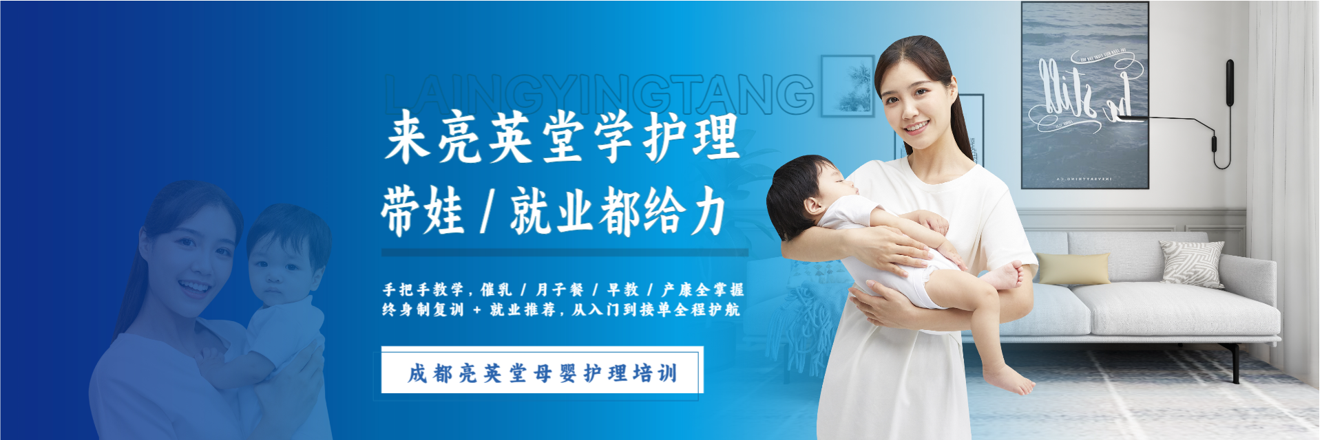 亮英堂职业技能培训学校是经人力资源和社会保障局批准成立的具有正规职业培训办学资质的培训机构,是一家专业从事高端月嫂、高端育儿嫂、高级催乳师、高级小儿推拿师、高级产后康复师、等母婴护理服务相关培训的专业培训学校。学校以高端母婴服务技能培训为核心,集职业技能培训、授权认证、就业安置及推荐为一体,秉承”以专业为标准、以就业为目标”的办学宗旨,致力于母婴护理服务行业培训更多的专业人才,从而进-步提升母婴护理服务者的个人能力、收入水平、社会地位,并不断推动母婴护理服务产业的健康发展,家政服务水平的不断提升,打造母婴护理服务一体化的西南知名的母婴护理服务培训学校。