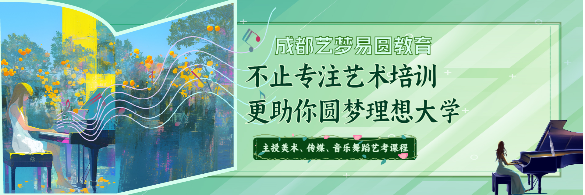成都艺梦易圆艺术教育成立十年,由“艺梦影路工作室”和“青蓝画室”强强联合而来,专注美术、传媒、音乐舞蹈艺术培训。学校紧邻地铁站,交通便利;绿树成荫,环境清幽;配备专业画室、琴房、舞蹈教室等齐全硬件设施;实行吃、住、学一体封闭式管理;推行“五师一体”服务(专业课老师、班主任、督学、生活老师、心理老师)及量化考核教学,每日任务当日清零,进步可视;与文化课学校紧密衔接,助力初三、高中学生实现理想大学目标。