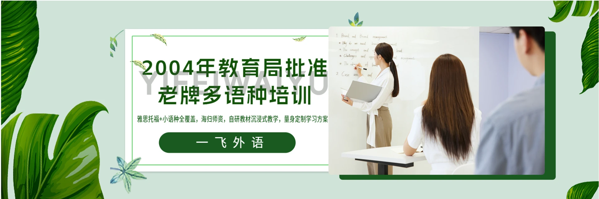一飞外语教育于2004年8月经福州市教育局批准成立,专业从事雅思、托福等出国英语及日、韩、德、意、法、西等小语种培训。作为福州本地老牌培训机构,教学背景雄厚,拥有海归师资阵容和规范教学系统。依托精准基础评估、量身定制课程、自主研发教材、班导全程跟踪及仿真模考等办学特色,采用沉浸式与互动式学习机制,打破传统‘知识’学习模式,有效提升学员外语水平,广受学员好评与认可。用温度成就学子。