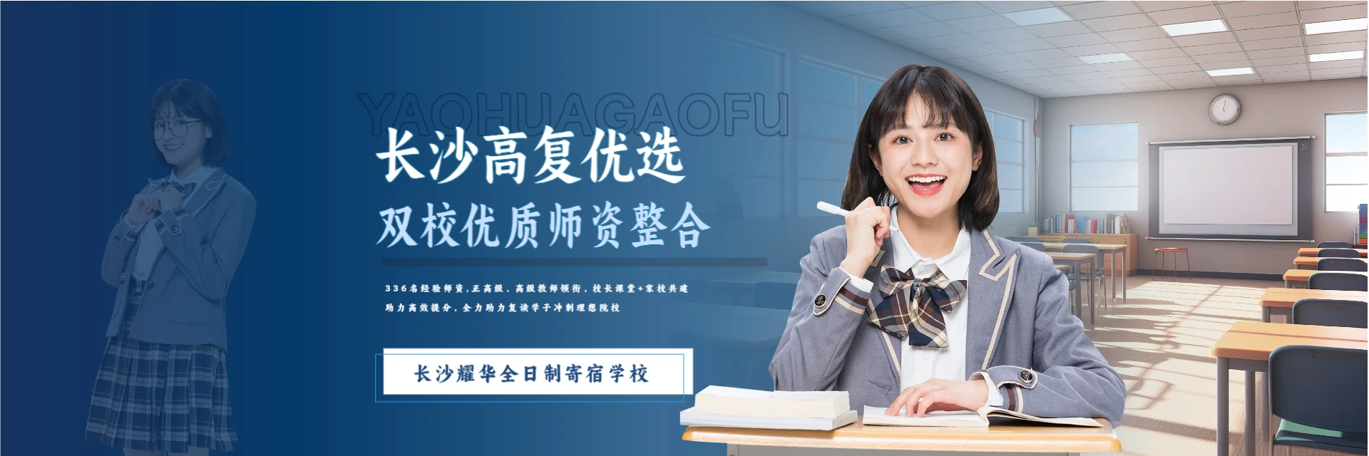 耀华高复是整合长沙市耀华高级中学、卓华高级中学优质教师资源打造的复读品牌。现有专职博士2人、高级教师21人、骨干教师11人;双博士驱动教学,执行校长周延前(北师大博士)、副校长陈日临(人大博士)全程指导学科问题与学习动力提升。坚持校长课堂、家校共建,每学期赴各地市开展家长座谈,构建教师主导、家长参与、学生成长联动机制。办学理念:一切以学生为中心,一切以教师为根本,一切以追求卓越为宗旨。