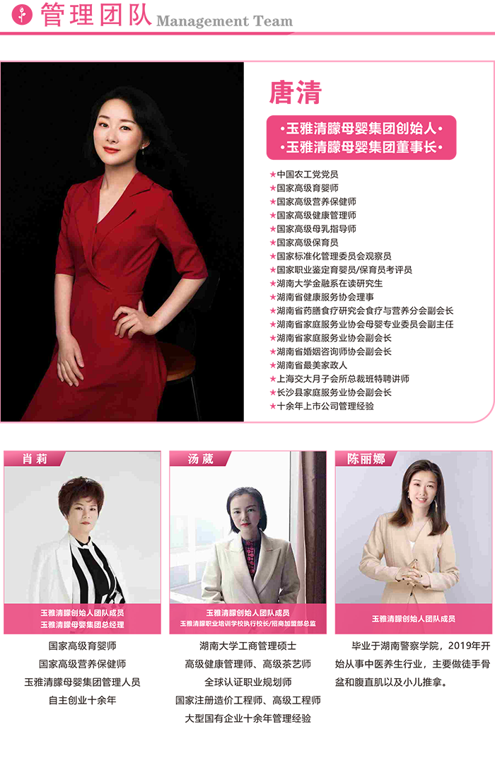 玉雅清朦母婴集团成立于2017年,总部在湖南长沙,是湖南省家庭服务业副会长单位、湖南省妇联巾帼示范基地、湖南省商务厅诚信经营单位、湖南省总工会授予创始人唐清女士最美家政人称号,长沙市人社局认定创业带动就业示范基地、吸纳就业重点示范单位,长沙市妇联巾帼示范基地、长沙市总工会女职工培训示范基地。业务涵盖:月子会所、月嫂育婴师上门、月嫂育婴师培训、产后康复、宝宝游泳等。目前在湖南拥有十家月子会所门店。