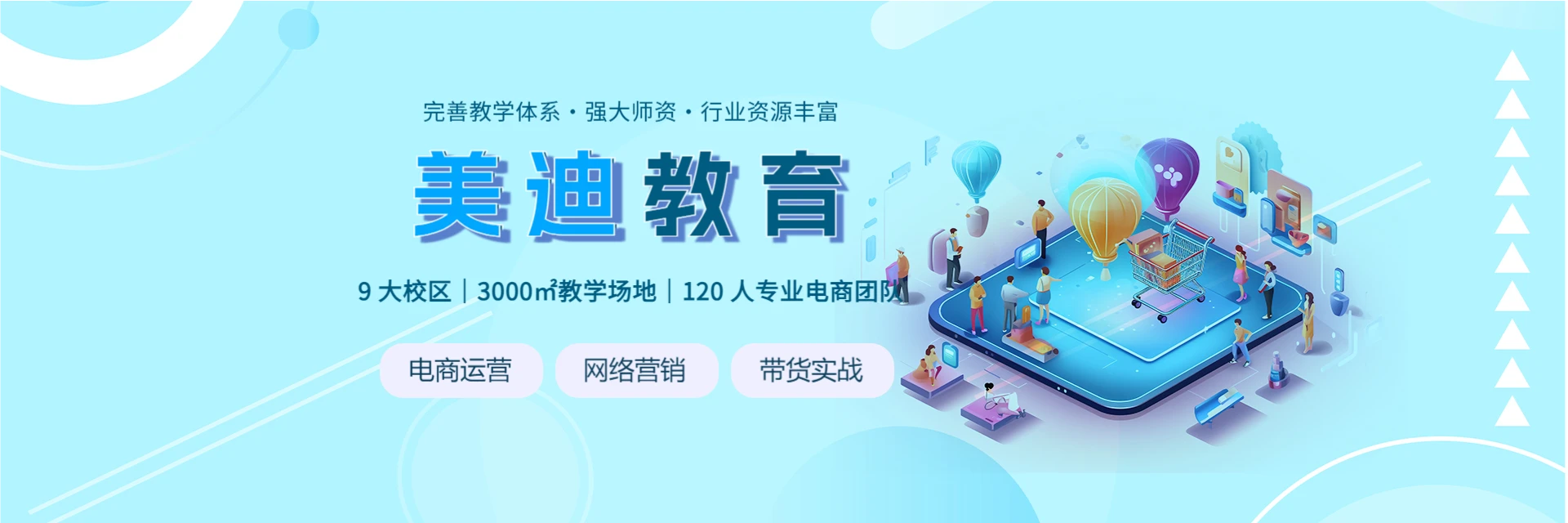 美迪电商教育创建于2013年,是华南专业的电商培训机构,现有13大校区、120人电商团队、5500平方米教学场地。依托完善教学体系、强大师资团队与丰富行业经验,已培训学员超20000人,年培训约5000人。致力于为企业提供专业、便捷、全方位的电商教育服务,助力传统企业转型、创业者启航、就业者成长。坚持‘诚信服务,用户至上’理念,提供培训、就业、招聘、运营顾问等一站式服务。