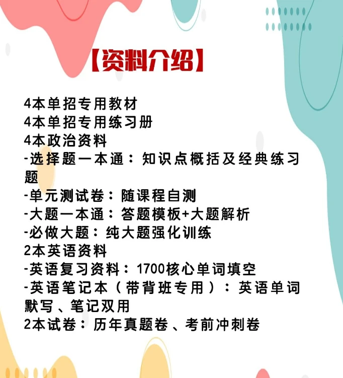 课程包含:4科配套教材同步讲解+课前课后跟踪指导+单招政策指南+历年真题试卷讲解+每月月考+考前模拟考